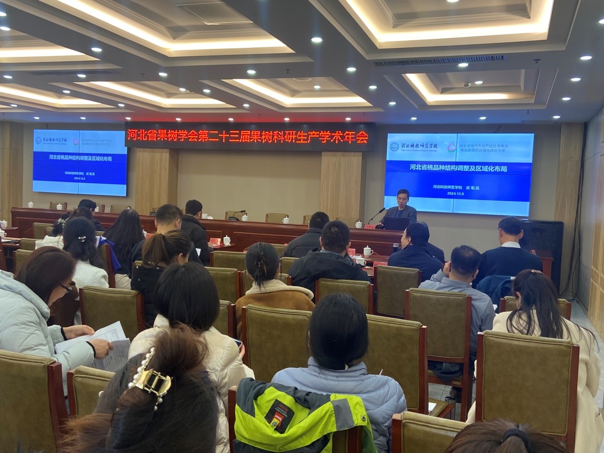 2024年12月7日-12月9日,“河北省果树学会第二十三届果树科研生产学术年会”在河北省邢台市岗底村召开,公司桃创新团队首席张立彬教授,园艺专业带头人肖啸教授,园艺科技公司党委书记、园艺学一级学科带头人、现代农业产业技术体系岗位专家武军凯教授以及果树教学部、中心试验室、板栗中心、果树方向研究生等共计19人应邀参加。武军凯教授在大会上做了题为“河北省桃品种结构调整及区域化布局”的学术报告,报告从2024年河北省10个市、70个县140多个桃园的品种区域化调查及受冻害情况等方面进行阐述,并与现场专家和农业企业负责人进行了热烈交流。